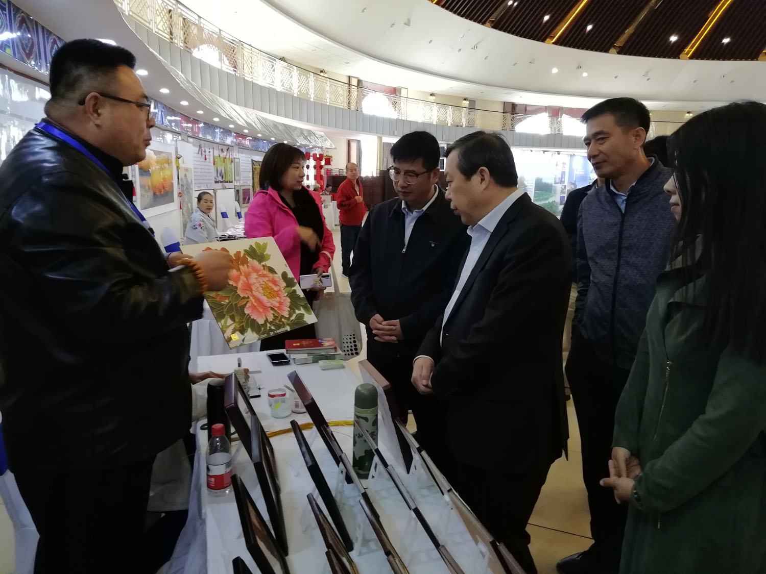 河北省文化和旅游廳黨組副書記 副廳長翟玉虎、市旅游和文化廣電局副局長王鵬飛在鄭鐵軍董事長的陪同下參觀了鄭氏砂畫展出作品,期間,董事長詳細(xì)的介紹了鄭氏砂藝非遺文化的發(fā)展歷程、工藝特點(diǎn)、制作手法、產(chǎn)品推廣現(xiàn)狀以及未來市場前景,并對領(lǐng)導(dǎo)提出的問題一一解答,最后,翟玉虎副書記對鄭氏砂藝予以充分的肯定,并提出要繼續(xù)努力,把非遺文化發(fā)揚(yáng)光大。