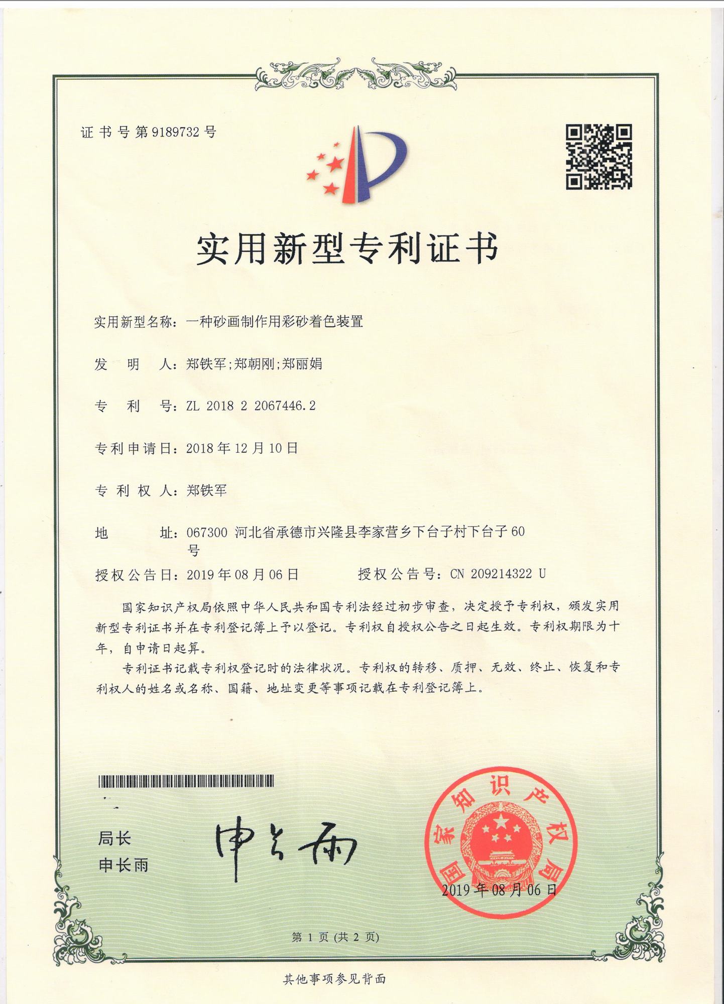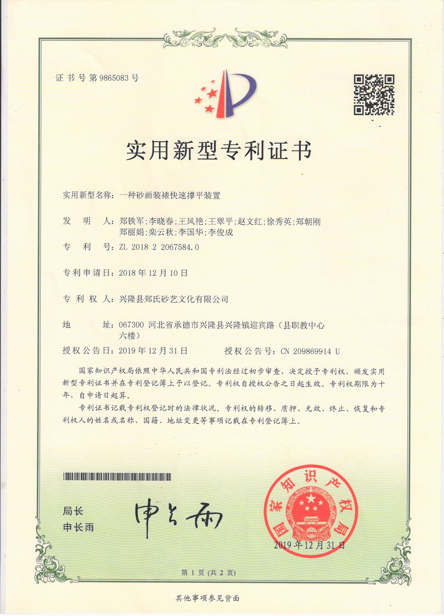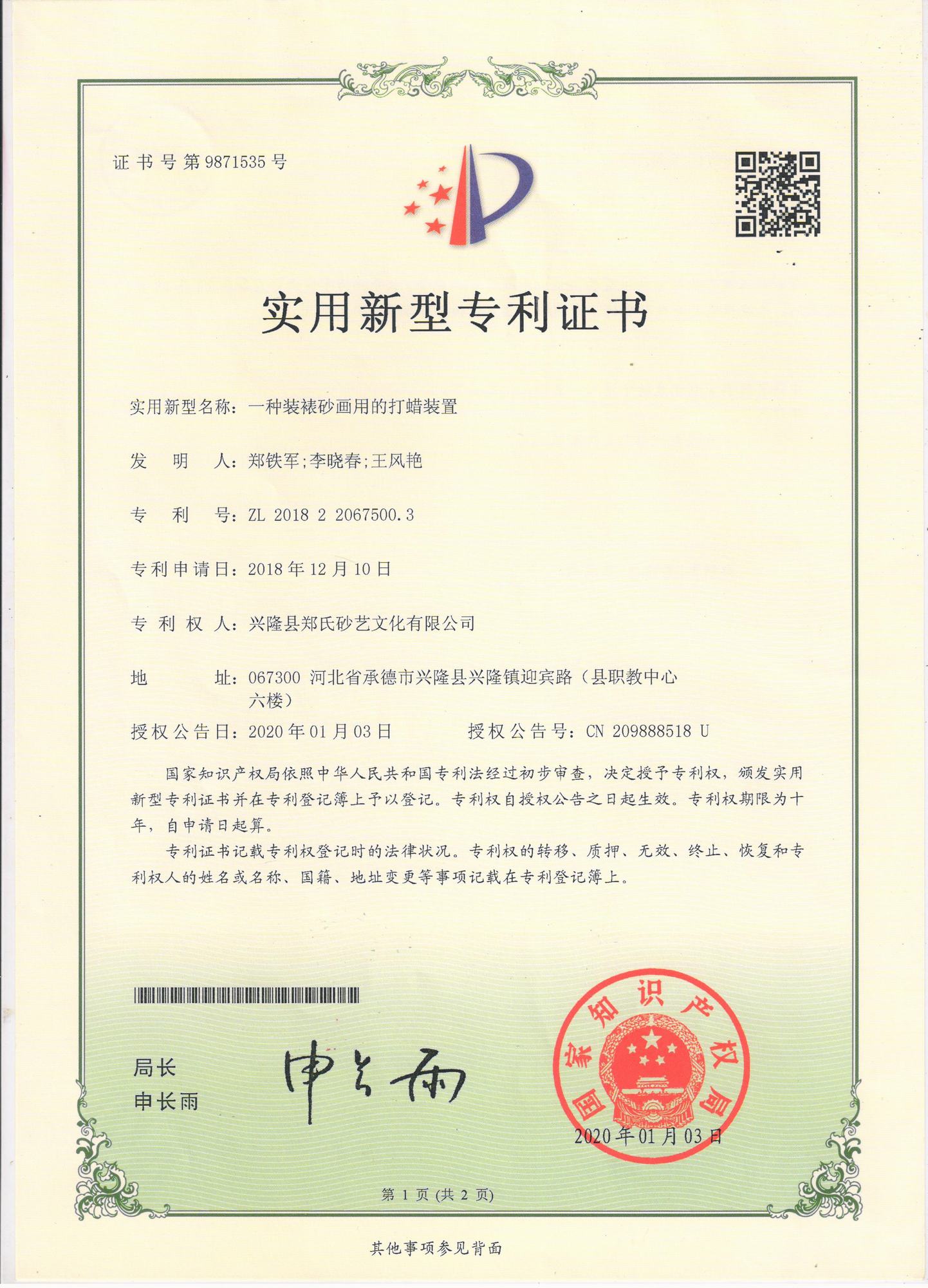 自鄭氏砂藝研究所成立以來(lái),經(jīng)過(guò)研發(fā)人員的不懈鉆研和努力,已經(jīng)陸續(xù)研發(fā)和申報(bào)了9項(xiàng)擁有自主知識(shí)產(chǎn)權(quán)的實(shí)用新型專利,目前為止9項(xiàng)專利全部獲得國(guó)家知識(shí)產(chǎn)權(quán)局的認(rèn)定。近年來(lái),公司根據(jù)自身的生產(chǎn)需求,積極成立了鄭氏砂藝研究所并獲得省工業(yè)和信息化廳批準(zhǔn),在研發(fā)過(guò)程中,公司先后投入數(shù)十萬(wàn)元,通過(guò)研發(fā)破解了生產(chǎn)過(guò)程中的技術(shù)難題,9項(xiàng)自主研發(fā)專利的成功也標(biāo)志著鄭氏砂藝研究所逐步走向成熟。