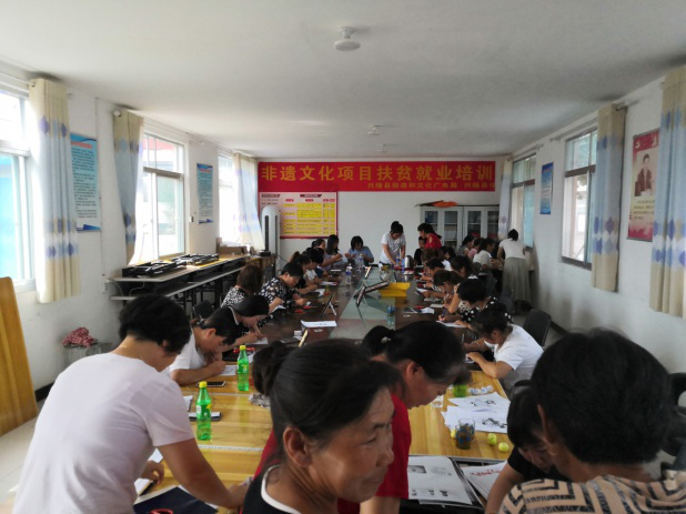 車(chē)河口村位于大杖子鎮(zhèn)政府東部2.5公里處,系潘家口水庫(kù)移民后靠村,處在車(chē)、柳、灤三河交匯點(diǎn)上。該村擁有人口1386口人,388戶。其中:貧困戶134戶,涉及貧困人口429人。由于大部分青壯勞力大都外出務(wù)工,村里只剩婦女、老人和兒童留守在家,婦女們除了給幾畝地玉米除除草,剩余時(shí)間全部用在哄孩子和閑聊上。鄭氏砂藝非遺文化扶貧項(xiàng)目的介入,得到廣大村民的積極響應(yīng),紛紛來(lái)到村委會(huì)參加培訓(xùn),她們仔細(xì)聽(tīng)講,認(rèn)真研學(xué)。學(xué)員們從描摹到布絲、從調(diào)膠到鋪砂,不放過(guò)每一個(gè)細(xì)節(jié)。在手中的作品上展現(xiàn)自己的才華。目前公司已對(duì)該村成立“車(chē)河口村非遺扶貧就業(yè)工坊”,在貧困戶中選出了技術(shù)過(guò)硬、能力較強(qiáng)的婦女擔(dān)任車(chē)間主任,目前該就業(yè)工坊已正式運(yùn)轉(zhuǎn)。