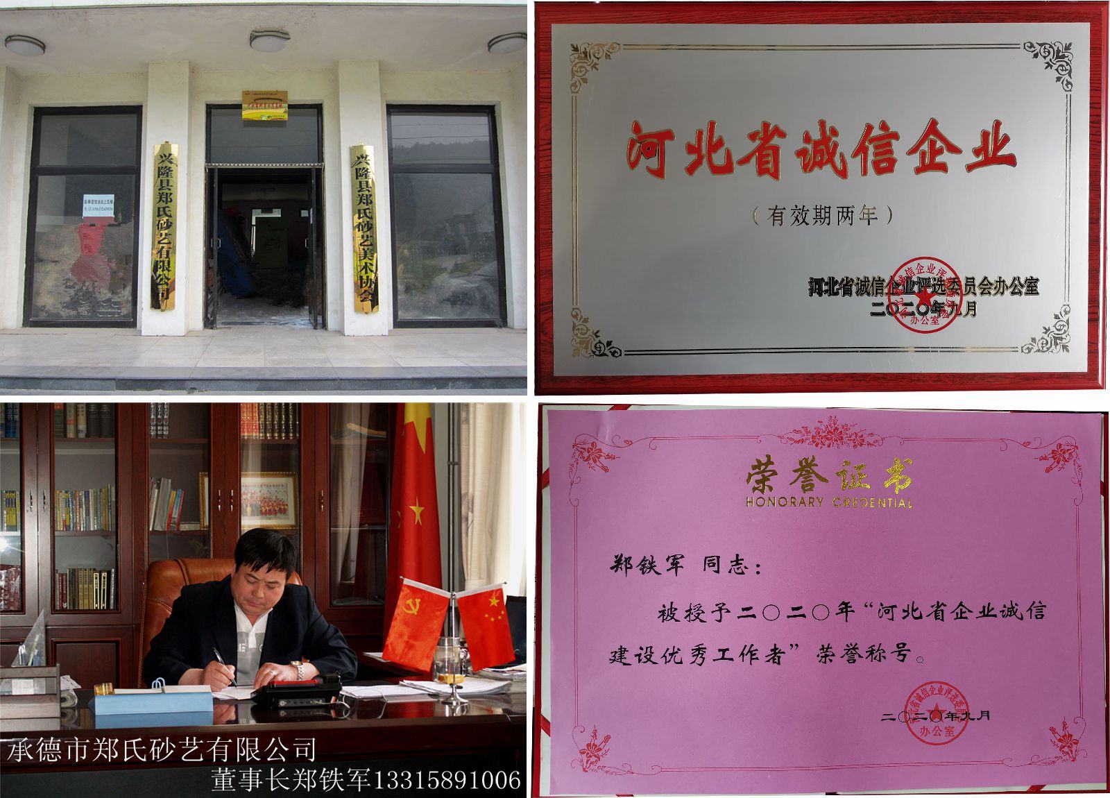 近日,歷時(shí)5個(gè)月,經(jīng)過層層選拔,興隆縣鄭氏砂藝文化有限公司再次被河北省誠信企業(yè)評(píng)審委員會(huì)評(píng)定為“河北省誠信企業(yè)”。興隆縣鄭氏砂藝文化有限公司董事長鄭鐵軍同志被授予“2020年度河北省企業(yè)誠信建設(shè)優(yōu)秀工作者”榮譽(yù)稱號(hào)。這是我公司自2014年以來連續(xù)四屆獲得此項(xiàng)殊榮。