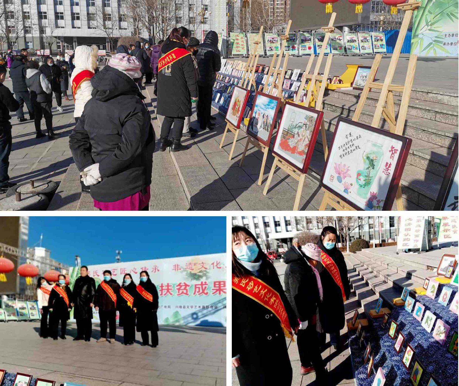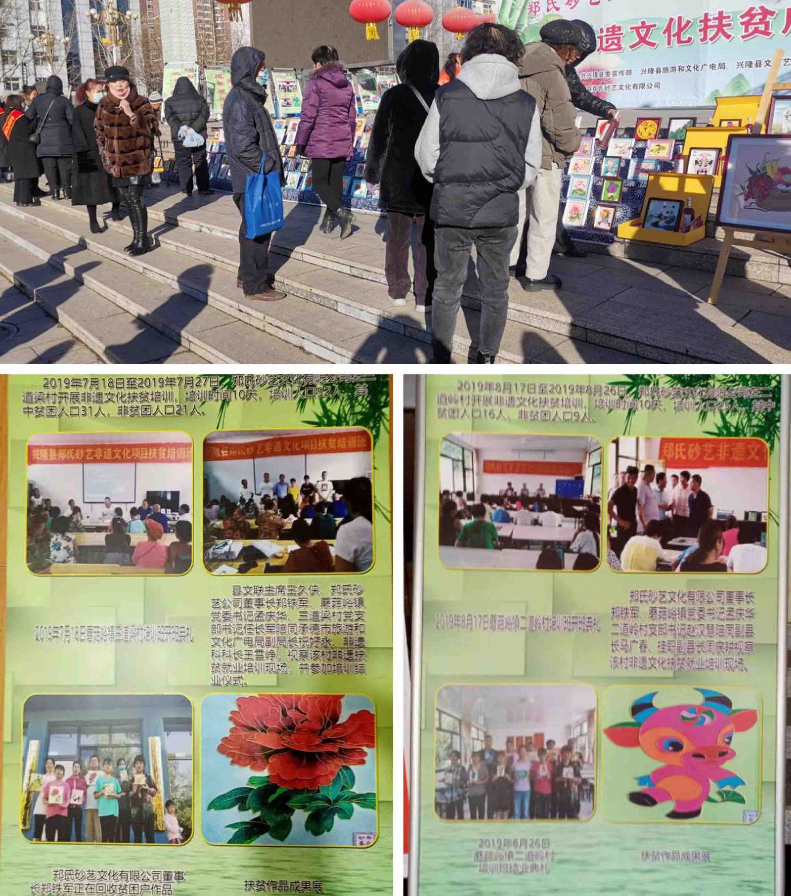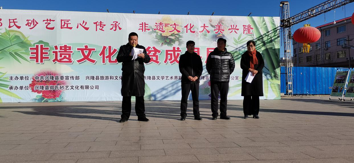2020年11月27日。由中共興隆縣委宣傳部、興隆縣旅游和文化廣電局、興隆縣文學(xué)藝術(shù)界聯(lián)合會(huì)、興隆縣扶貧開(kāi)發(fā)辦公室主辦的、由興隆縣鄭氏砂藝文化有限公司承辦的《非遺文化扶貧成果展》在興隆縣中心廣場(chǎng)拉開(kāi)帷幕。展會(huì)由興隆縣文學(xué)藝術(shù)界聯(lián)合會(huì)主席王久俠主持,鄭氏砂藝文化 有限公司董事長(zhǎng)鄭鐵軍致開(kāi)幕詞。文聯(lián)主席王久俠作重要講話(huà)。她說(shuō):“鄭氏砂藝是祖?zhèn)骷妓嚕瑤啄陙?lái)鄭氏砂藝積極開(kāi)展非遺文化扶貧,培訓(xùn)全縣400余名貧困婦女,制作出了具有飽含鄉(xiāng)土氣息,美輪美奐的砂藝作品。讓他們用巧手脫貧致富,為脫貧攻堅(jiān)作出顯著貢獻(xiàn)。”隨后縣委宣傳部常務(wù)副部長(zhǎng)隋云鵬、縣旅游和文化廣電局黨委書(shū)記閆海濤、文聯(lián)主席王久俠由砂藝公司董事長(zhǎng)鄭鐵軍、公司工會(huì)主席趙文紅等引導(dǎo)下,觀摩了“扶貧培訓(xùn)成果展區(qū)”、“消費(fèi)扶貧展區(qū)”、“貧困戶(hù)作品展區(qū)”及“愛(ài)心認(rèn)購(gòu)展區(qū)”。四區(qū)展介及作品。對(duì)鄭氏砂藝非遺文化扶貧成果給予充分肯定,并興致勃勃地欣賞了鄭氏砂藝美輪美奐的貧困戶(hù)作品。