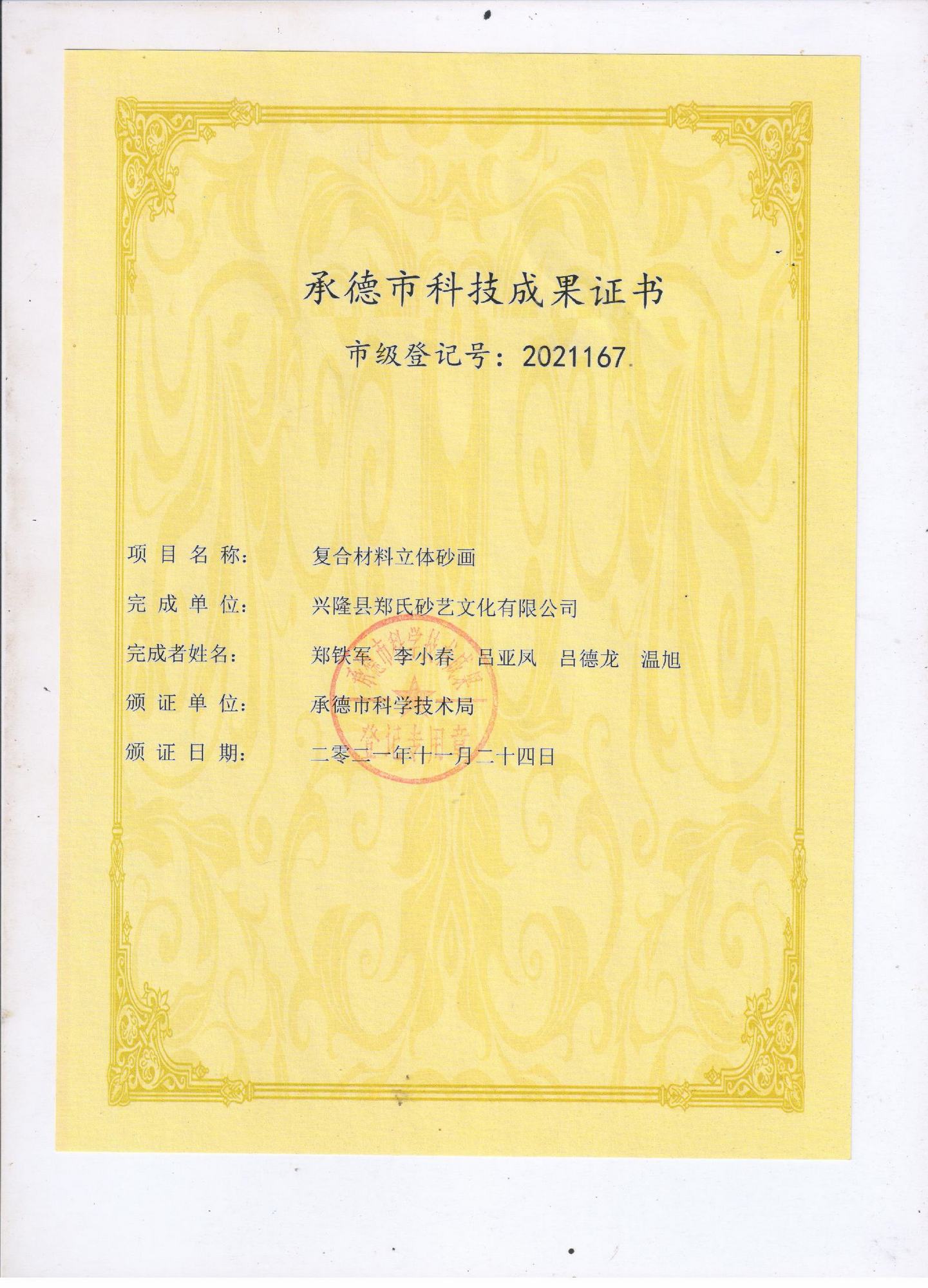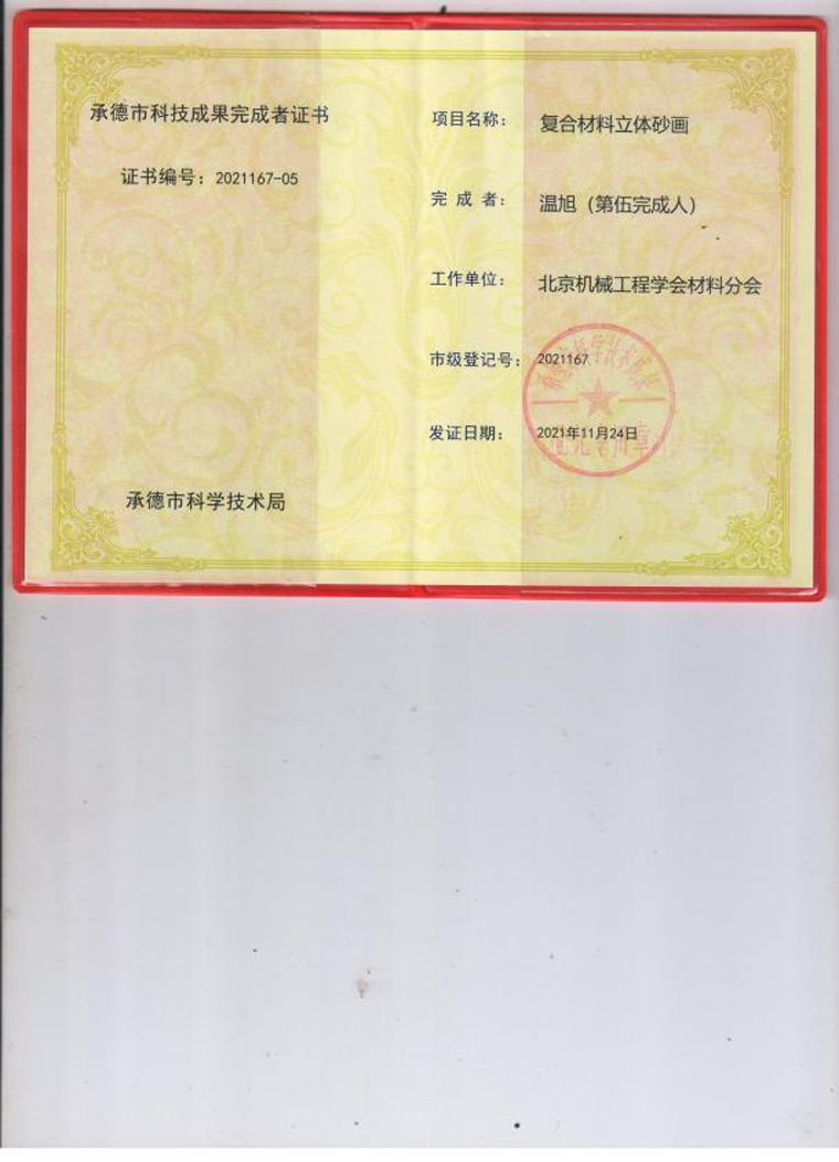 2021年11月24日,鄭氏砂藝圓滿完成了復(fù)合材料立體砂畫項(xiàng)目,獲得由承德市科技局頒發(fā)的《承德市科技成果證書》(市級(jí)登記號(hào):2021167),該項(xiàng)目課題來源于承德市科學(xué)技術(shù)研究與發(fā)展計(jì)劃,由我公司和北京機(jī)械工程學(xué)會(huì)材料分會(huì)共同完成。項(xiàng)目以天然彩砂和金屬絲為主要材料,畫面中加入其它復(fù)合材料(如山楂核、樹葉等),制成立體砂畫,砂畫畫面采用透明樹脂壓膜技術(shù),保持彩砂畫面與膜不脫落,不褪色。通過該項(xiàng)目的研究,企業(yè)創(chuàng)新產(chǎn)品5個(gè)系列200多種作品,其中包括:砂畫木質(zhì)筆筒系列、水晶砂畫系列、砂畫手機(jī)殼系列、磁盤砂畫系列、活性炭砂畫系列,極大的提升企業(yè)產(chǎn)品質(zhì)量。