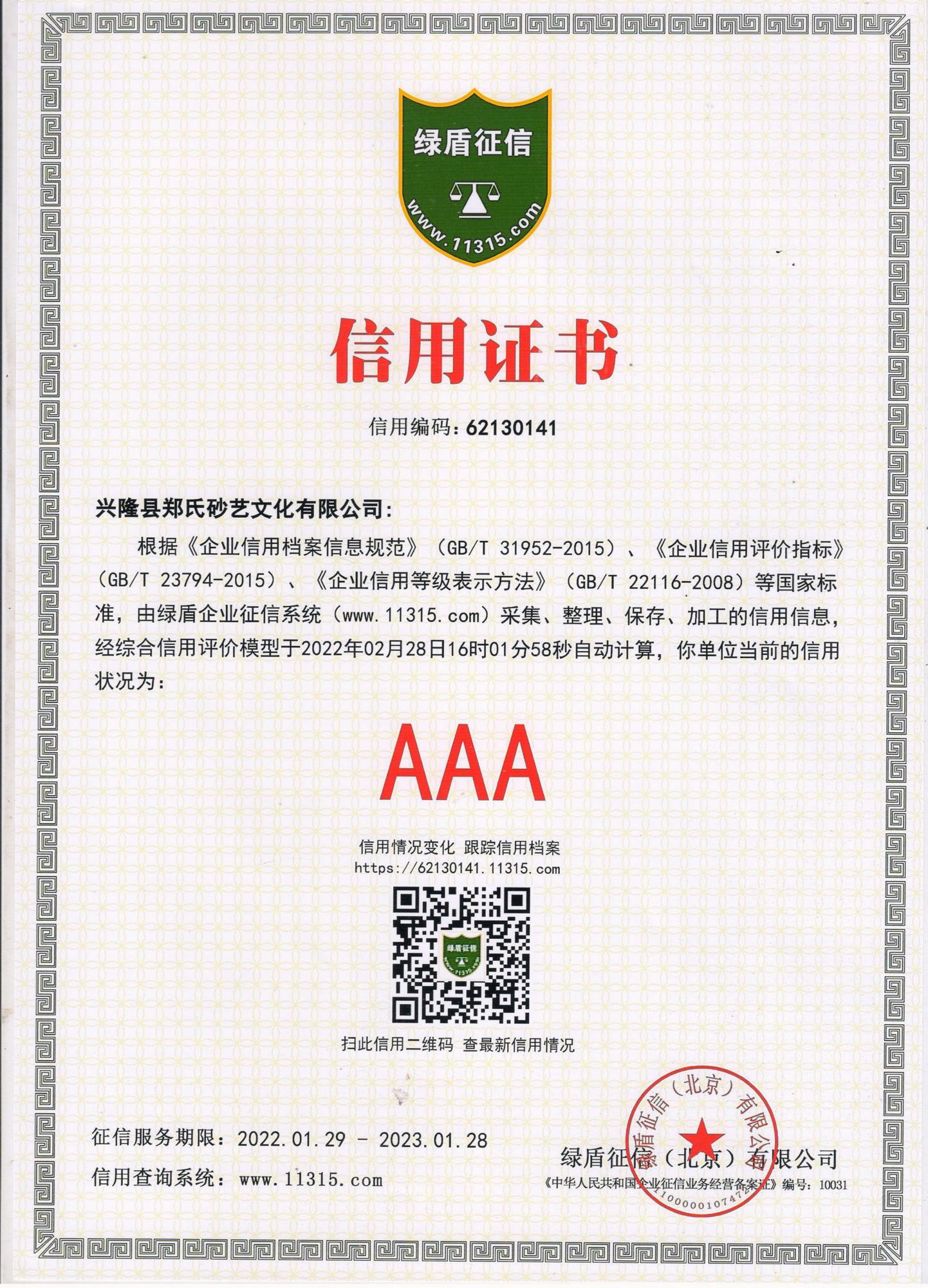 2022年,根據(jù)綠盾企業(yè)征信系統(tǒng)(www.11315.com)采集、整理、保存、加工的信息,經(jīng)綜合信用評(píng)價(jià)模型自動(dòng)評(píng)估,興隆縣鄭氏砂藝文化有限公司被評(píng)為AAA級(jí)信用企業(yè),并授予綠盾征信“信用證書”,企業(yè)已連續(xù)五年獲此殊榮。