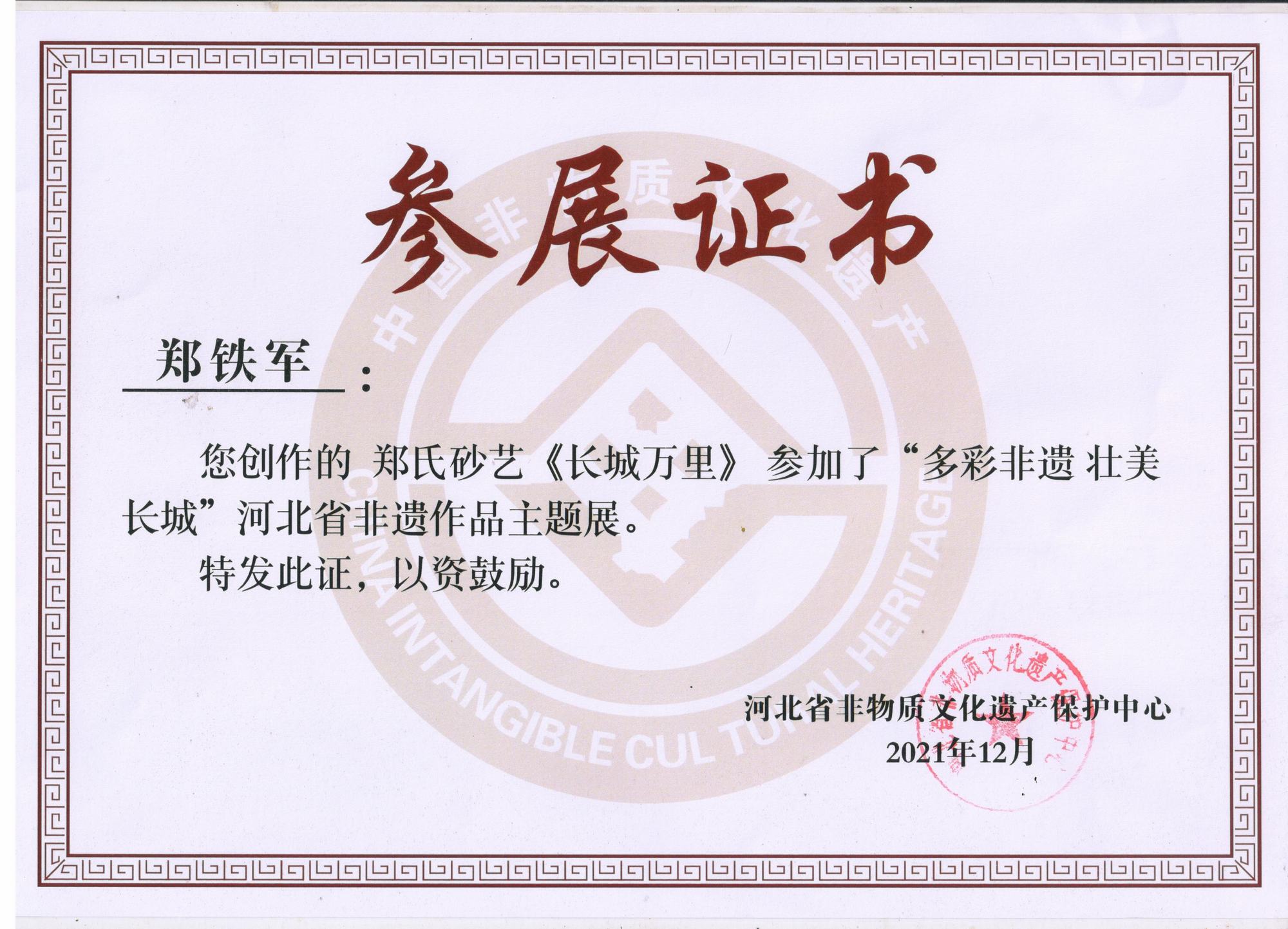 近期,鄭氏砂藝多次應(yīng)邀參加了省、市相關(guān)單位舉辦的各項(xiàng)展出活動(dòng),參展的非遺砂畫作品和研發(fā)的旅游商品得到了社會(huì)各界人士的一致好評(píng),被活動(dòng)組委會(huì)給予了很大的肯定,在一定程度上提高了我縣和“非遺”文化鄭氏砂藝的知名度。2021年12月,鄭鐵軍董事長(zhǎng)的砂畫作品《長(zhǎng)城萬(wàn)里》入選“多彩非遺 壯美長(zhǎng)城”河北省非遺作品主題展,并在河北省“非遺”保護(hù)中心展出。2022年1月,鄭氏砂藝砂畫作品《薪火相傳》榮獲“弘揚(yáng)塞罕壩精神文創(chuàng)產(chǎn)品大賽”一等獎(jiǎng)。2022年1月,鄭氏砂藝多項(xiàng)作品在承德市旅游協(xié)會(huì)舉辦的“傳承非遺手工技藝、助力鄉(xiāng)村振興”活動(dòng)榮獲獎(jiǎng)項(xiàng)。2022年2月,鄭氏砂藝董事長(zhǎng)鄭鐵軍在全市開展的“鄉(xiāng)村振興黨旗紅 文藝創(chuàng)新樹先鋒”活動(dòng)中表現(xiàn)突出,榮獲“承德市2021年度優(yōu)秀鄉(xiāng)村文藝家會(huì)員”稱號(hào)。