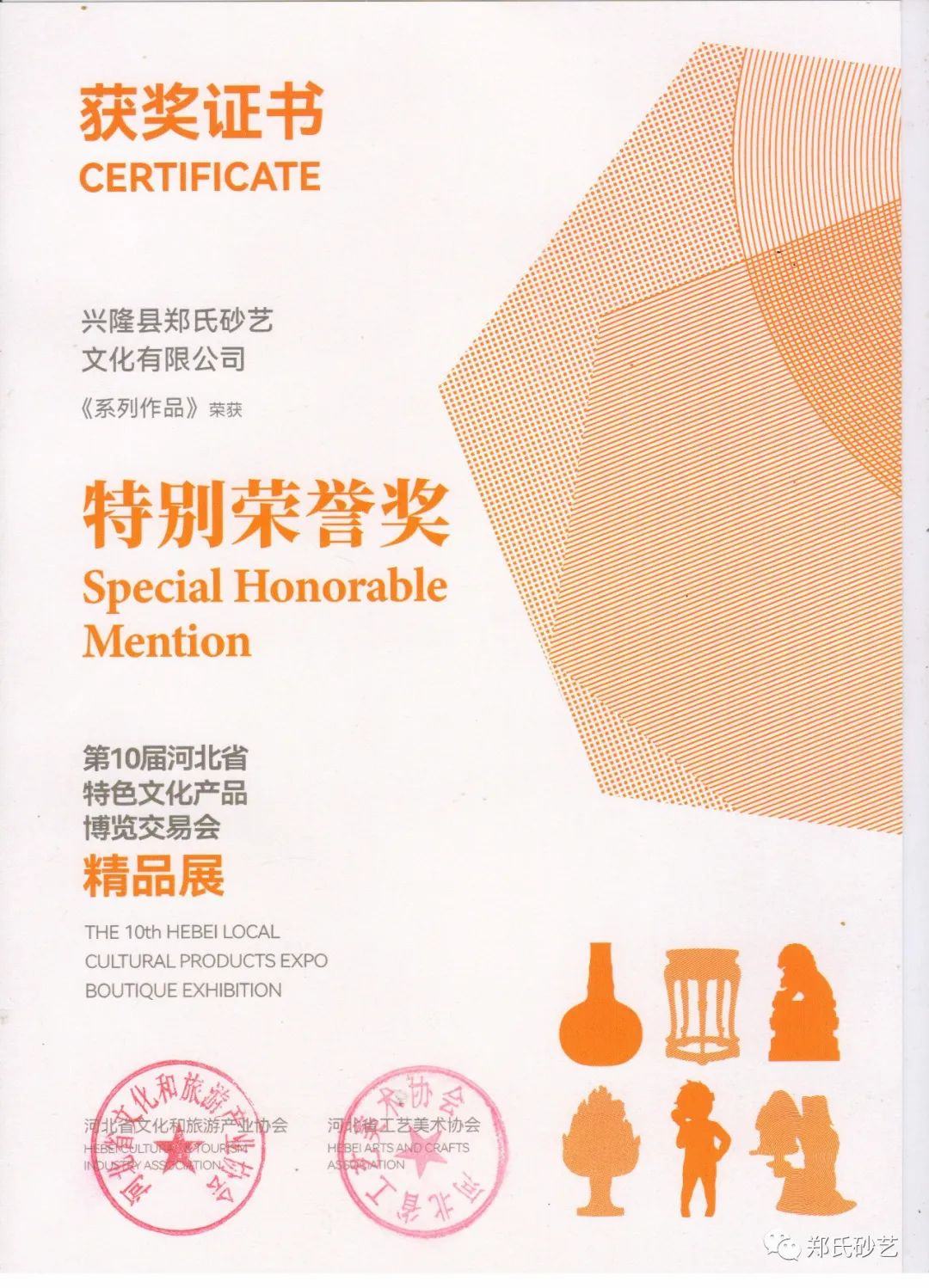 近日,由河北省文化和旅游產業(yè)協(xié)會、河北省工藝美術協(xié)會聯(lián)合舉辦的“第十屆河北省特色文化產品博覽交易會精品展”在石家莊舉行,鄭氏砂藝應邀參加了此次活動,其中鄭氏砂藝砂畫作品《紅紅火火》、《中國夢》等系列作品榮獲了第十屆河北省特色文化產品博覽交易會“特別榮譽獎”。