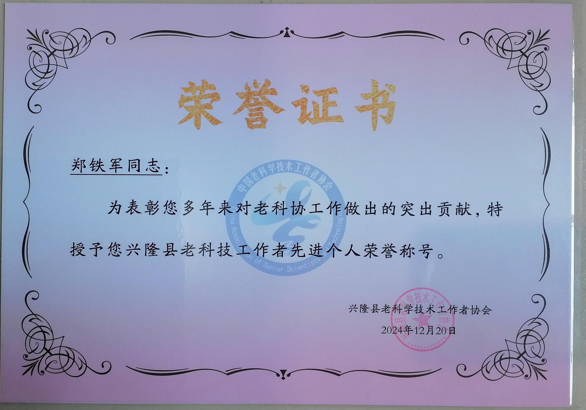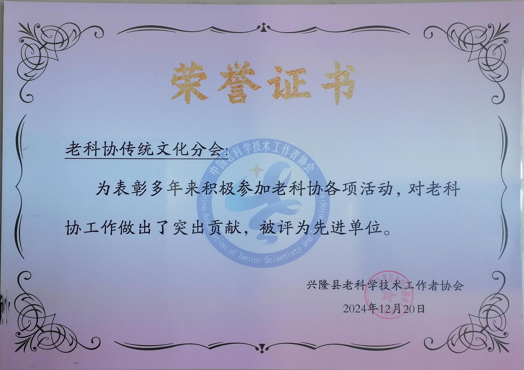 2024年12月20日上午,興隆縣老科協(xié)2024年度總結(jié)表彰大會(huì)及2025年迎新年聯(lián)歡會(huì),在縣老干部局一樓活動(dòng)中心隆重舉行。老干部局三級(jí)主任科員陸雅麗、縣老科協(xié)會(huì)長(zhǎng)張江以及各分會(huì)的會(huì)長(zhǎng)、副會(huì)長(zhǎng)和全體100多名會(huì)員出席了此次盛會(huì)。在此次大會(huì)上,興隆縣老科協(xié)傳統(tǒng)文化分會(huì)榮獲先進(jìn)單位榮譽(yù)稱號(hào),老科協(xié)理事、傳統(tǒng)文化分會(huì)會(huì)長(zhǎng)鄭鐵軍同志榮獲老科協(xié)先進(jìn)個(gè)人榮譽(yù)稱號(hào)。