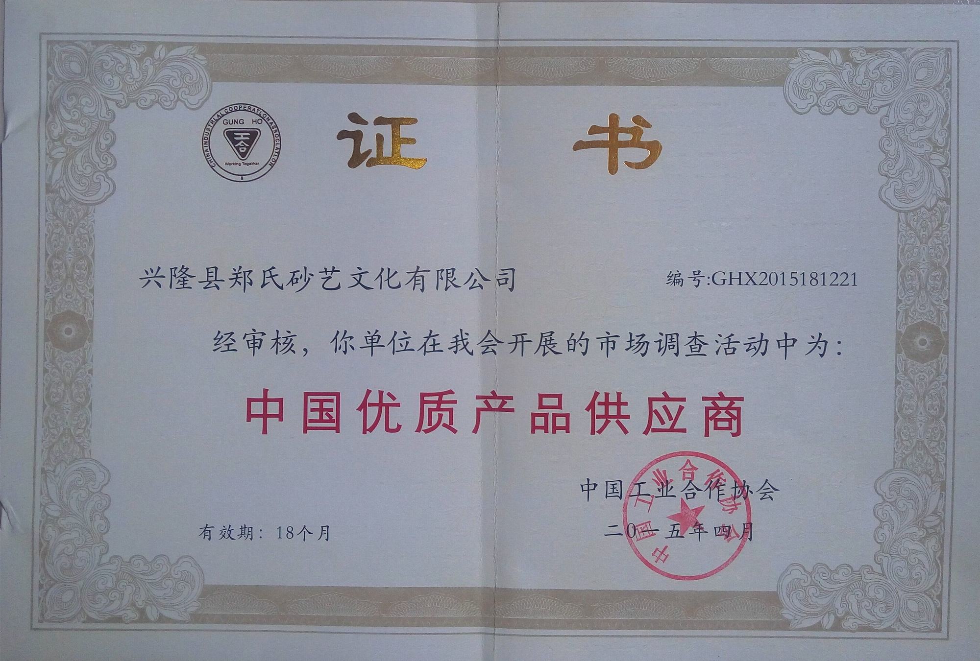 2015年4月,鄭氏砂藝被中國工業(yè)合作協(xié)會確定為《中國優(yōu)質(zhì)產(chǎn)品供應(yīng)商》。